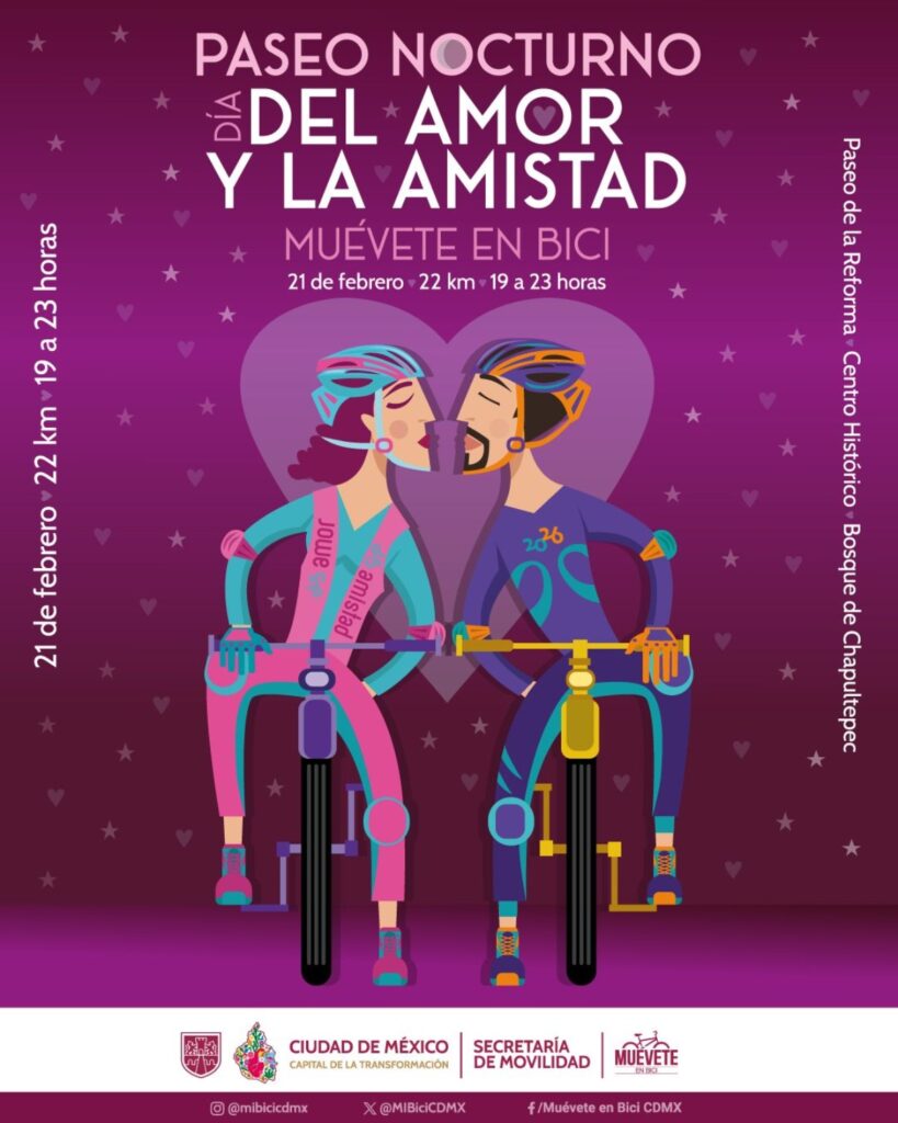 Organizado por Muévete en Bici, este recorrido especial llenará de luz las principales avenidas de la capital con actividades deportivas, música y sorpresas para disfrutar en pareja, con amigos o en familia. La invitación es clara: prepara la bici, patines, patineta y sumarse a una noche dedicada al ejercicio, la convivencia y el romance urbano.