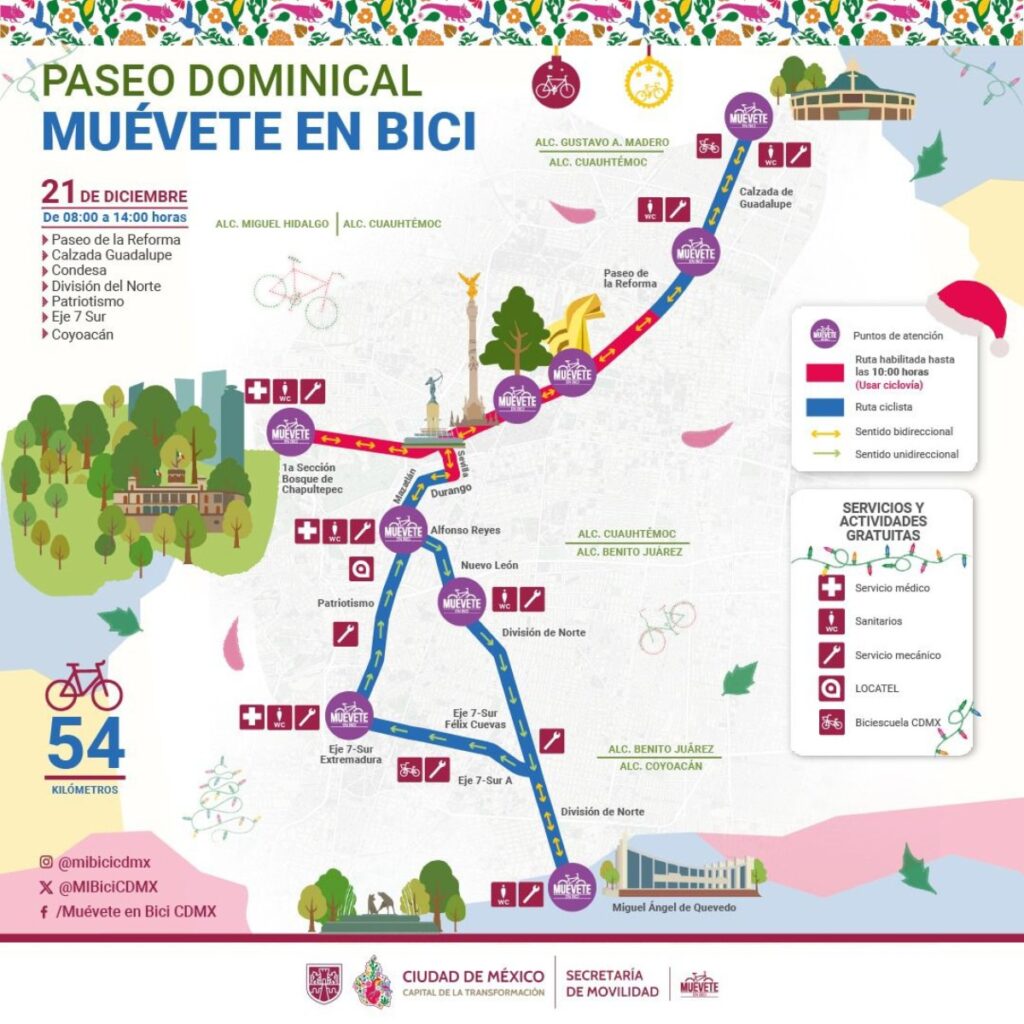 “Paseo de la Reforma desde la Glorieta de Simón Bolívar hasta La Fortuna, pasando por Calzada de Guadalupe, y el tramo Sur, que recorre las calles Durango, Mazatlán, Alfonso Reyes y Nuevo León, hasta las avenidas División del Norte, Eje 7 Sur y Patriotismo, quedando así toda la ruta disponible para disfrutar el Paseo Dominical”, así informó la Secretaría de Movilidad.