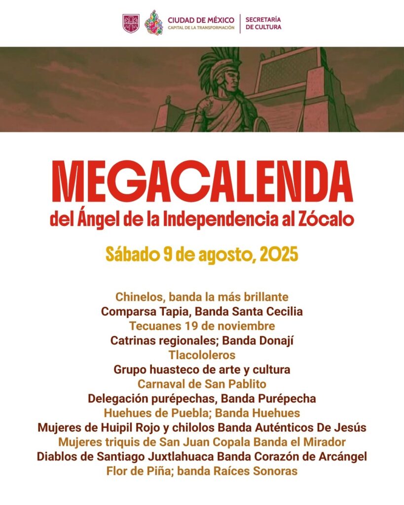 La Mega Calenda 2025 se llevará a cabo el sábado 9 de agosto de 2025, a partir de las 9:00 horas en el Ángel de la Independencia. El desfile terminará a las 12:00 horas, pero las actividades continuarán en la Fiesta de las Culturas Indígenas.