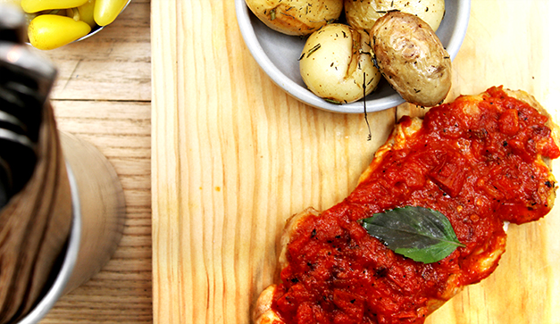 Pero esta vez lo que me llamó la atención de los nuevos platillos no fue una pizza, sino el pollo en salsa de jitomate deshidratado y albahaca, acompañado de papas César. Un contramuslo suave y jugoso, para compartir, que presume un sutil sabor condimentado gracias a que está bañado en una salsa de tomates frescos especiados. Se sirve con la piel frita como base, lo que le da una textura crujiente que contrasta con el resto de la carne.