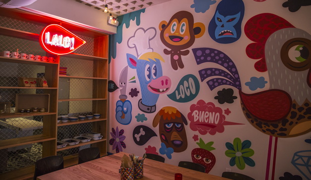 Aquí la cosa es bastante relajada, la idea es que no comas solo y, si quieres, hagas buenas migas con los otros comensales sentados en la mesa comunal. Para romper el hielo, de fondo musical hay canciones para todas las generaciones, un letrero incandescente y el elemento estrella: un grafiti del artista belga David Rop, “Bué The Warrior”, donde, ya lo verás, estarás tentado a tomarte una selfie.