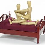 Wooden figures during sex in the bed. Symbolic representation sex position. Couple having sex in stand.