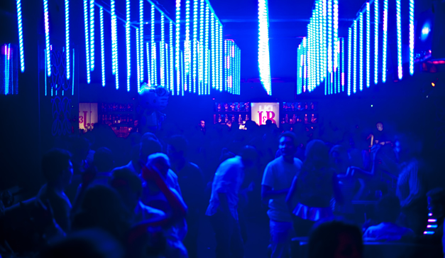 Sus paredes negras con luces neón, incrustadas como si fueran ecualizador, cambian al ritmo de la música. El lugar tiene una pequeña pista triangular. Detrás de la barra hay fuentes bailarinas con luces de colores.