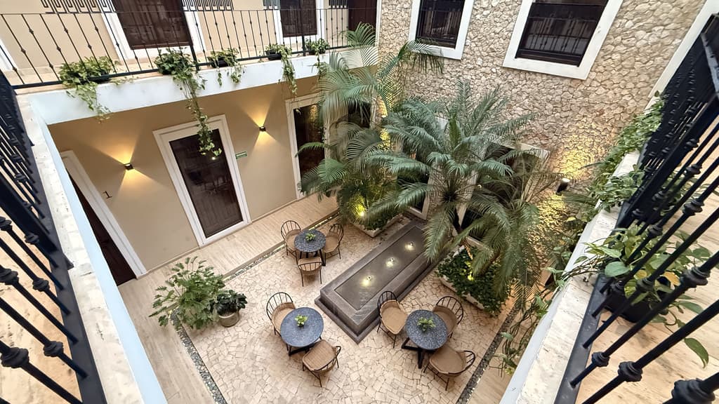 Adentro encontrarás lofts convertidos en habitaciones, un carril de nado entre los espacios, murales que hacen referencia a la ciudad y materiales locales como madera de tzalam y acabados de chukum. Te recomendamos una habitación que dé al patio central por la mezcla de diseño, luz natural y naturaleza.