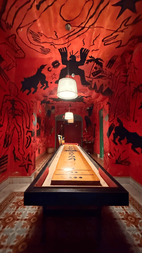 Ánima te recibe con un lobby rojo y teatral donde podrás echarte una partida de shuffleboard mientras esperas tu mesa. Al fondo y detrás de una cortina, una pequeña biblioteca será la entrada a un gran patio donde la madera, la piedra y el fuego son los protagonistas. Aquí todo está pensado para que el fuego y la parrilla sean el corazón de este espacio y claro, de la comida.